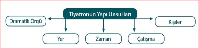 Tiyatronun yapı unsurları; dramatik örgü, yer, zaman, çatışma ve kişilerdir.